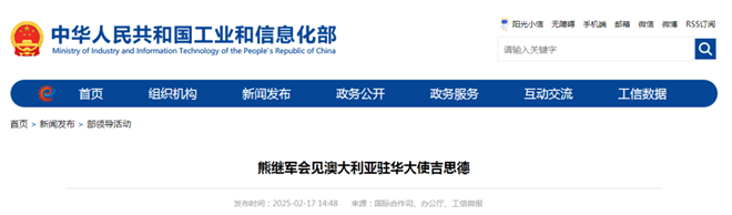 近日,工業(yè)和信息化部副部長熊繼軍在京會見澳大利亞駐華大使吉思德,雙方就深化工業(yè)和信息化領(lǐng)域合作進行交流。