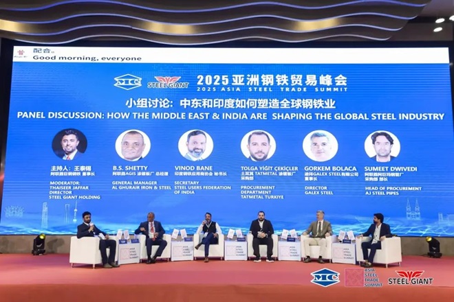 在“中東和印度如何塑造全球鋼鐵業”小組討論環節,阿聯酋AGIS涂鍍板廠總經理B.S.SHETTY,印度鋼鐵應用商協會秘書長VINOD BANE,土耳其TATMETAL涂鍍板廠采購部TOLGA YiGIT CEKICLER,迪拜GALEX STEEL有限公司董事長GORKEM BOLACA,阿聯酋阿巨瑪鋼管廠采購部部長SUMEET DWIVEDI,圍繞中東、印度的國內鋼鐵需求及國際貿易現狀,展望了未來發展的潛力空間。