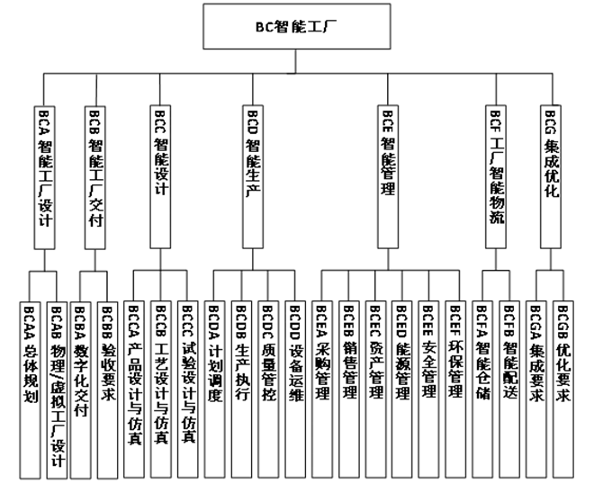 主要包括智能工廠設(shè)計、智能工廠交付、智能設(shè)計、智能生產(chǎn)、智能管理、工廠智能物流、集成優(yōu)化等7個部分,如圖7所示。主要規(guī)定智能工廠設(shè)計與交付,智能工廠運營時的設(shè)計、生產(chǎn)、管理、物流、系統(tǒng)集成等內(nèi)容。