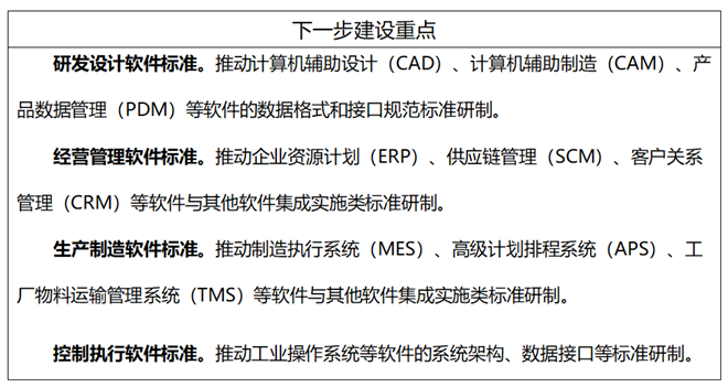 主要包括制造執(zhí)行系統(tǒng)(MES)、高級計劃排程系統(tǒng)(APS)、工廠物料運輸管理系統(tǒng)(TMS)、能源管理系統(tǒng)(EMS)、故障預(yù)測與健康管理軟件(PHM)、運維綜合保障管理(MRO)等生產(chǎn)制造軟件應(yīng)用指南和集成實施標(biāo)準(zhǔn)。