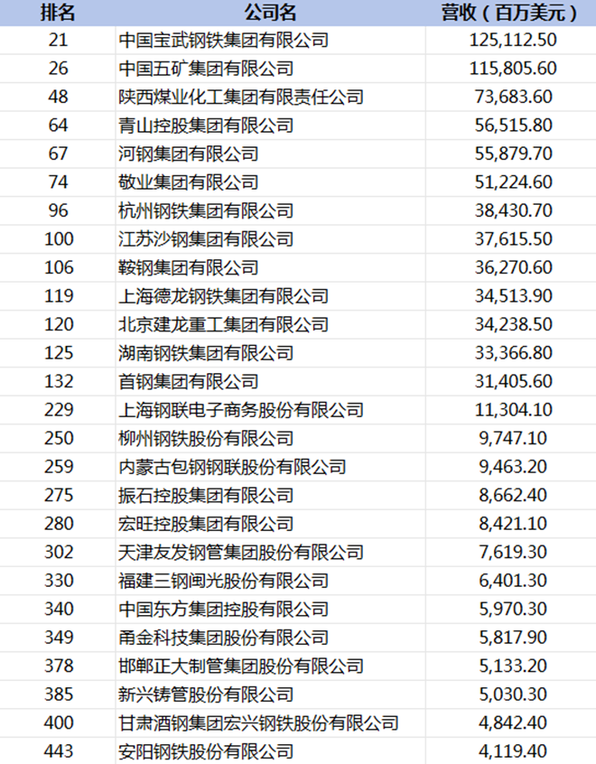 該榜單包含多家鋼鐵相關(guān)企業(yè),具體名單整理如下: