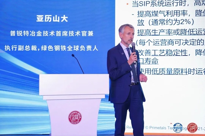 普銳特冶金技術首席技術官兼執行副總裁、綠色鋼鐵全球負責人亞歷山大博士做題為《綠色鋼鐵轉型——從承諾走向執行》的主題演講時表示,當前鋼鐵行業脫碳面臨全球經濟放緩、產能過剩、地緣政治不穩定、缺少合格人力資源等諸多不利因素影響,普銳特冶金技術正通過可持續性發展轉型和數字化轉型兩個變革路徑重新定義鋼鐵的未來,他介紹了普銳特冶金技術推進數字和可持續冶金革命的三個階段,分為優化階段、過渡階段、綠鋼階段,并詳細介紹了在每個階段普銳特冶金技術為鋼鐵冶金流程提供的技術方案。