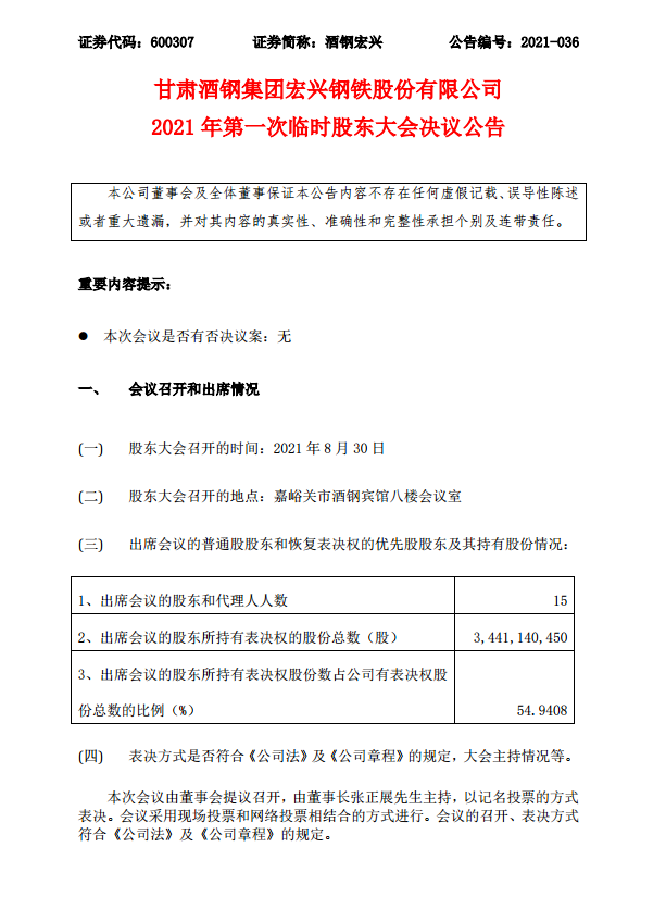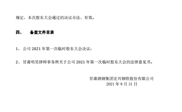 酒鋼宏興2021年第一次臨時股東大會決議公告