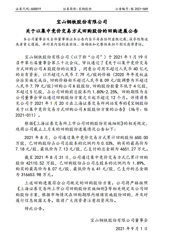 寶鋼股份關于以集中競價交易方式回購股份的回購進展公告