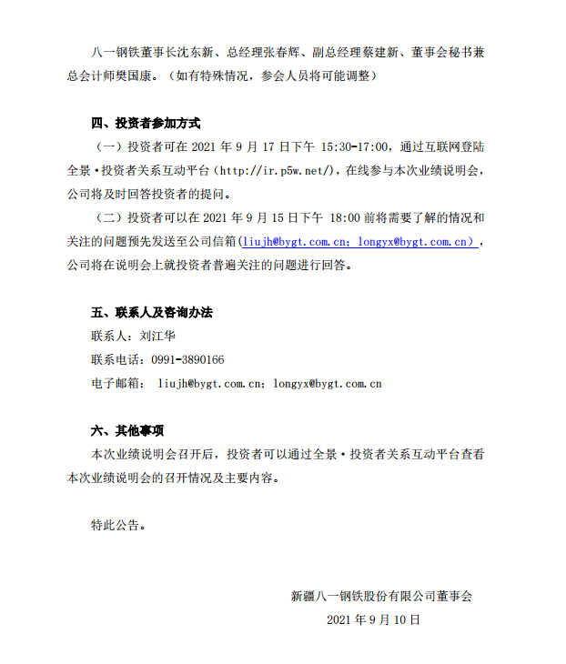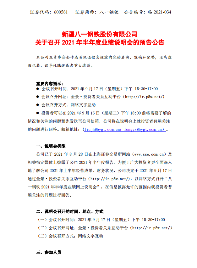 新疆八一鋼鐵股份有限公司關(guān)于召開2021年半年度業(yè)績(jī)說明會(huì)的預(yù)告公告