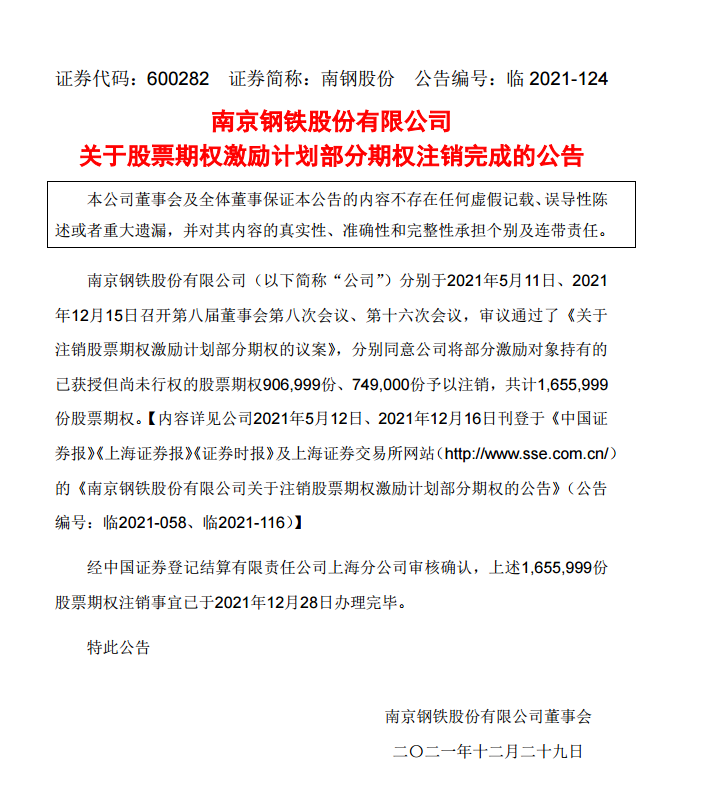 南京鋼鐵股份有限公司關于股票期權激勵計劃部分期權注銷完成的公告