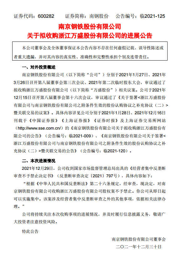 南京鋼鐵股份有限公司關于擬收購浙江萬盛股份有限公司的進展公告