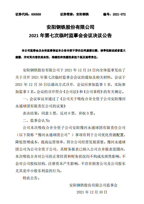 安陽鋼鐵股份有限公司2021年第七次臨時監事會會議決議公告