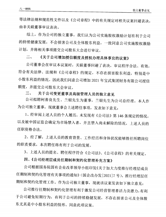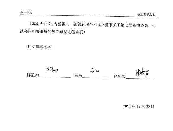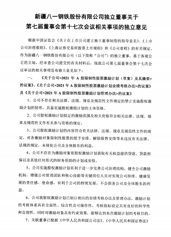 新疆八一鋼鐵股份有限公司獨立董事關于第七屆董事會第十七次會議相關事項的獨立意見