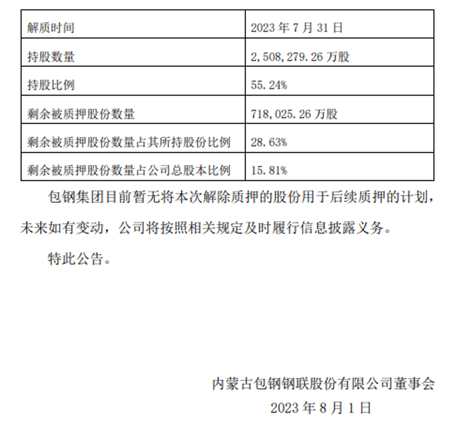 包鋼股份:包鋼股份股份解除質(zhì)押公告