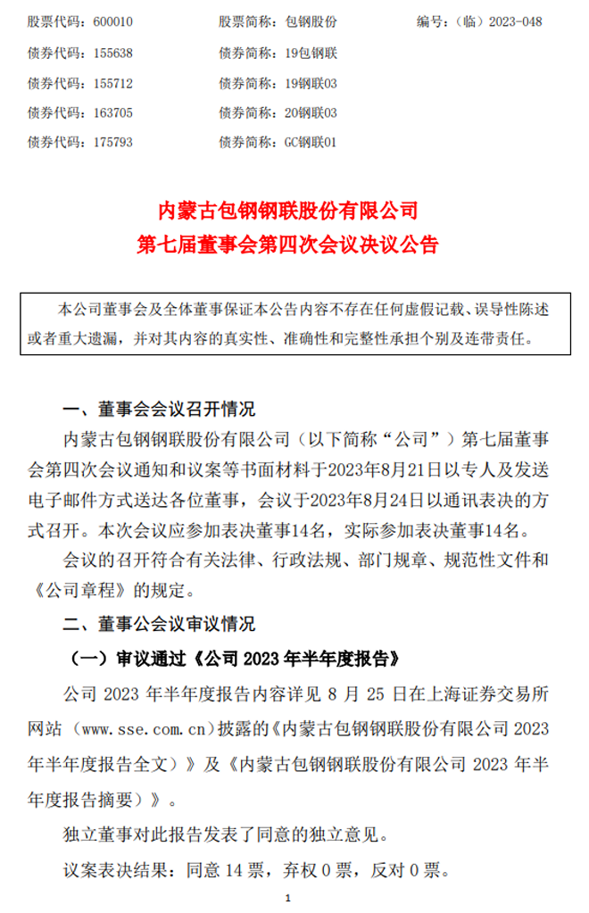 包鋼股份:包鋼股份第七屆董事會第四次會議決議公告