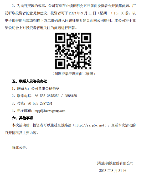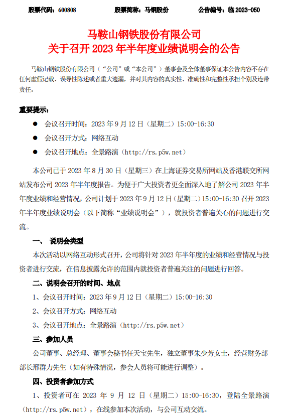 馬鋼股份:馬鞍山鋼鐵股份有限公司關(guān)于召開2023年半年度業(yè)績說明會的公告