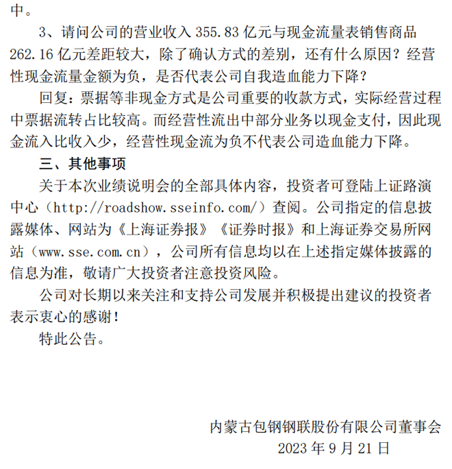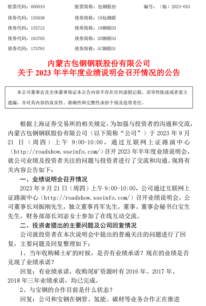 包鋼股份:包鋼股份關(guān)于2023年半年度業(yè)績(jī)說(shuō)明會(huì)召開情況的公告