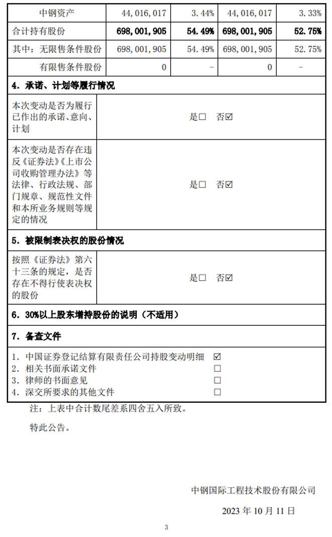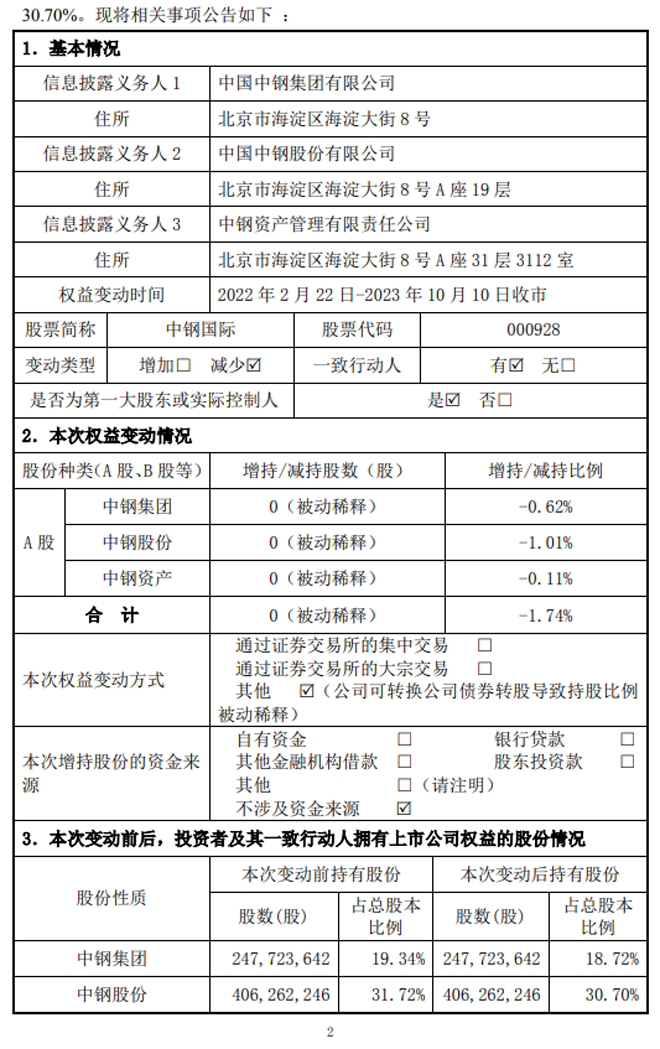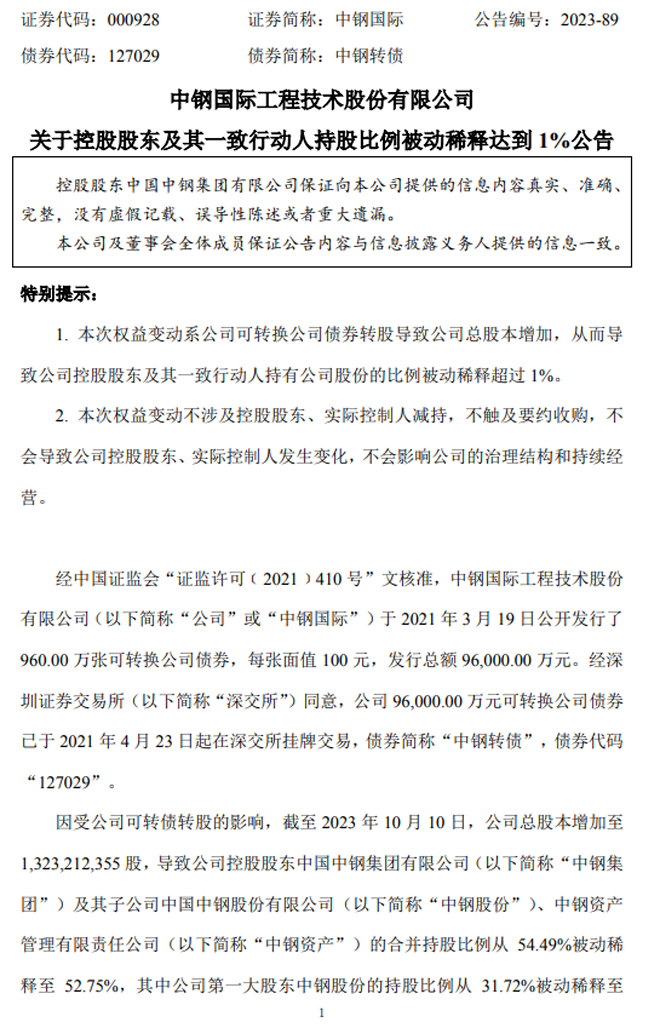 中鋼國際:關于控股股東及其一致行動人持股比例被動稀釋達到1%公告