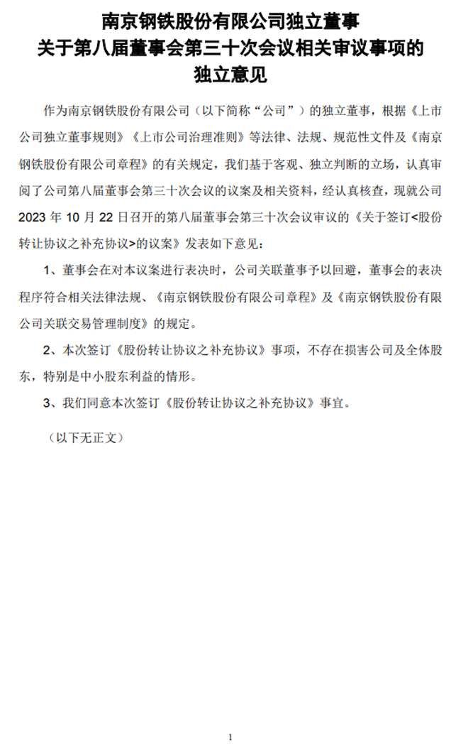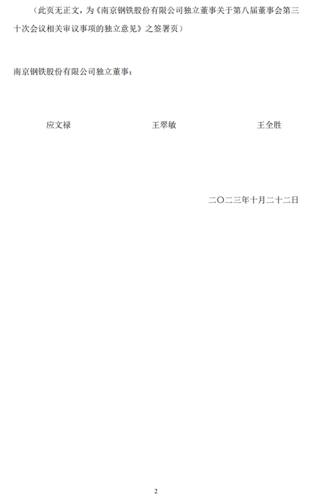 南鋼股份:南京鋼鐵股份有限公司獨立董事關于第八屆董事會第三十次會議相關審議事項的獨立意見