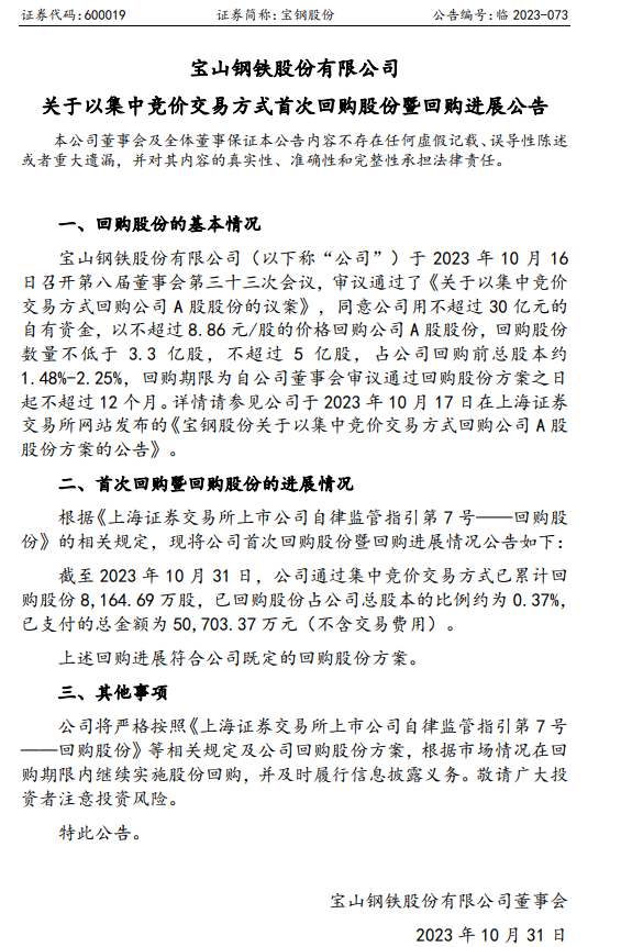 寶鋼股份:寶鋼股份關于以集中競價交易方式首次回購股份暨回購進展公告
