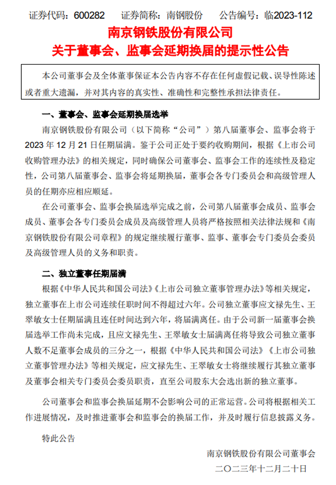 南鋼股份:南京鋼鐵股份有限公司關于董事會、監事會延期換屆的提示性公告
