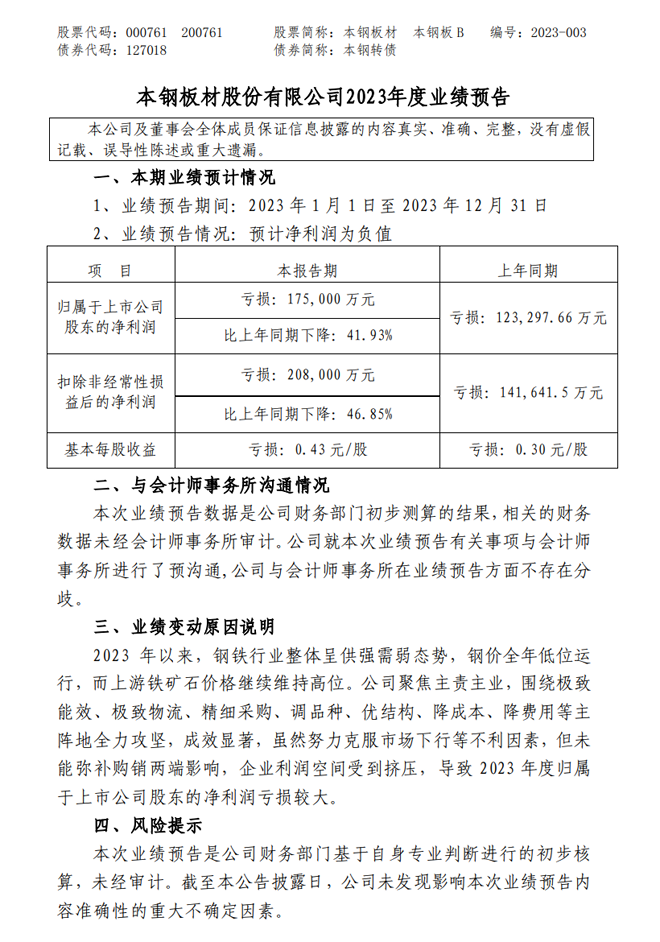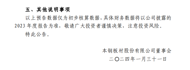 本鋼板材:本鋼板材股份有限公司2023年度業績預告