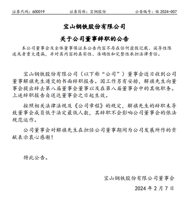 寶鋼股份:寶鋼股份關(guān)于公司董事辭職的公告