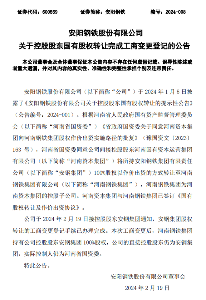 安陽鋼鐵:安陽鋼鐵股份有限公司關于控股股東國有股權轉讓完成工商變更登記的公告