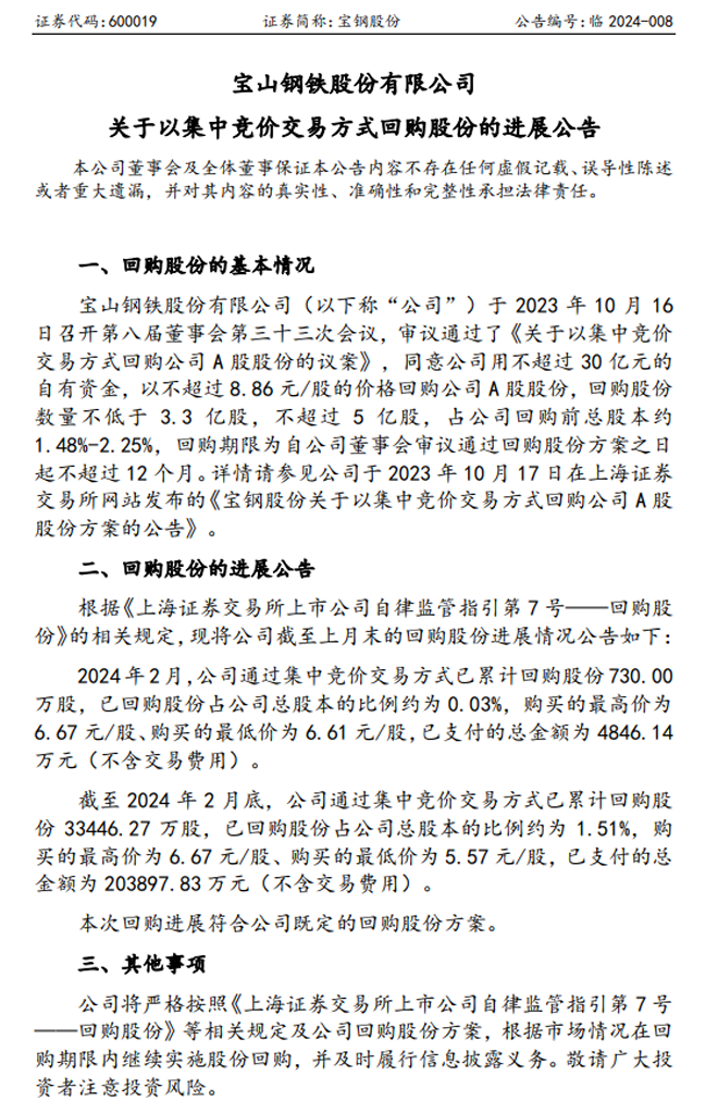 寶鋼股份:寶鋼股份關于以集中競價交易方式回購股份的進展公告