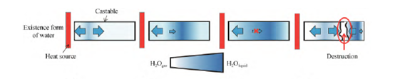 噴注料爆裂機理如下:在烘烤開始階段,材料外表面受熱,內部的自由水和結合水受熱開始氣化,向材料兩側擴散;隨著烘烤的持續進行,氣化的水蒸氣逐步向材料內部聚集,氣壓逐漸增大,當蒸氣壓強超過材料的本身強度時,就會發生噴注料的崩裂和脫落的現象。噴注料爆裂機理如下圖所示。
