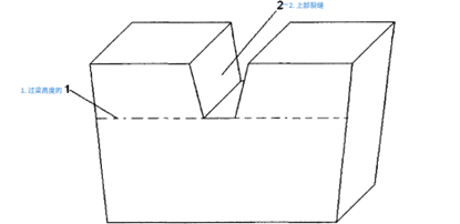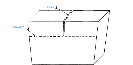 目前撇渣器大多采用預(yù)制模塊化設(shè)計(jì),采用ASC材料體系已成共識(shí),但是撇渣器的結(jié)構(gòu)化設(shè)計(jì)仍有許多改進(jìn)之處。預(yù)制撇渣器過梁在使用過程中特別容易發(fā)生中間縱向開裂進(jìn)而發(fā)生漏渣過渣問題。發(fā)生開裂的原因主要是過梁的下部浸泡在溫度高達(dá)1450℃左右高溫鐵水中,耐火材料發(fā)生較大的熱膨脹,而上部有約1/3~1/5高度則裸在空氣中處于較低溫度,上表面溫度一般只有300℃左右,其線性膨脹量顯然遠(yuǎn)小于過梁的下部。因此開裂一般從上部開始,一般在除鐵后2~3爐即已經(jīng)出現(xiàn),并逐步擴(kuò)大向下延伸如下圖所示: